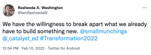 - The opening keynote featuring Dr. Tatum, moderated by Tre Johnson, partner of diversity, equity, and inclusion at Catalyst:Ed, started with a conversation around cultural wars and the “collective tension” between those willing to deepen their understanding of race and racism and their historical implications and those who reject it. This led to a discussion on what healthy accountability looks like and how the discomfort stemming from the current debate around critical race theory (CRT) might be signs of empathy and what Dr. Tatum calls “evidence of progress.”